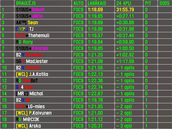 Gábor's winning rate has gone down recently,however yesterday he was again on top of the game - he was fastest in qualifying by almost a second,scoring his 4th pole position in this scored season and 27th overall,but after start found himself in chaser's position for 5 laps,then the road to victory lane was free of competition - the hungarian led the remaining 19 laps to score his 33rd RTFR race win (2 weeks too late for numberology fans),setting record breaking 29th fastest lap of the race,which is now sole highest in RTFR history. Additionally Gábor rounded his top5 count up to 60,while this was the 40th race he led - also now all time highest,breaking a tie with Botsi. Unite finished the race in runner up position already 27 seconds apart leader with a progress of 4 positions between green and chequered - that's his best finish of this season and 80th top5 finish in total. Sean repeated his previous best finishing position by finishing 3rd after hard battle - 4th top5 finish into his account. His rival was TJ,who worked hard,but never found way pass for podium finish,so he had to settle for 4th position,which is is 8th top5 finish. Top5 was closed by Thehemuli,who scored his 2nd top5 finish in row and 10th overall.