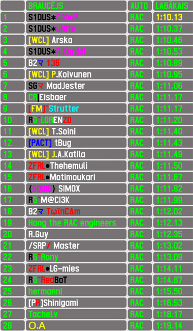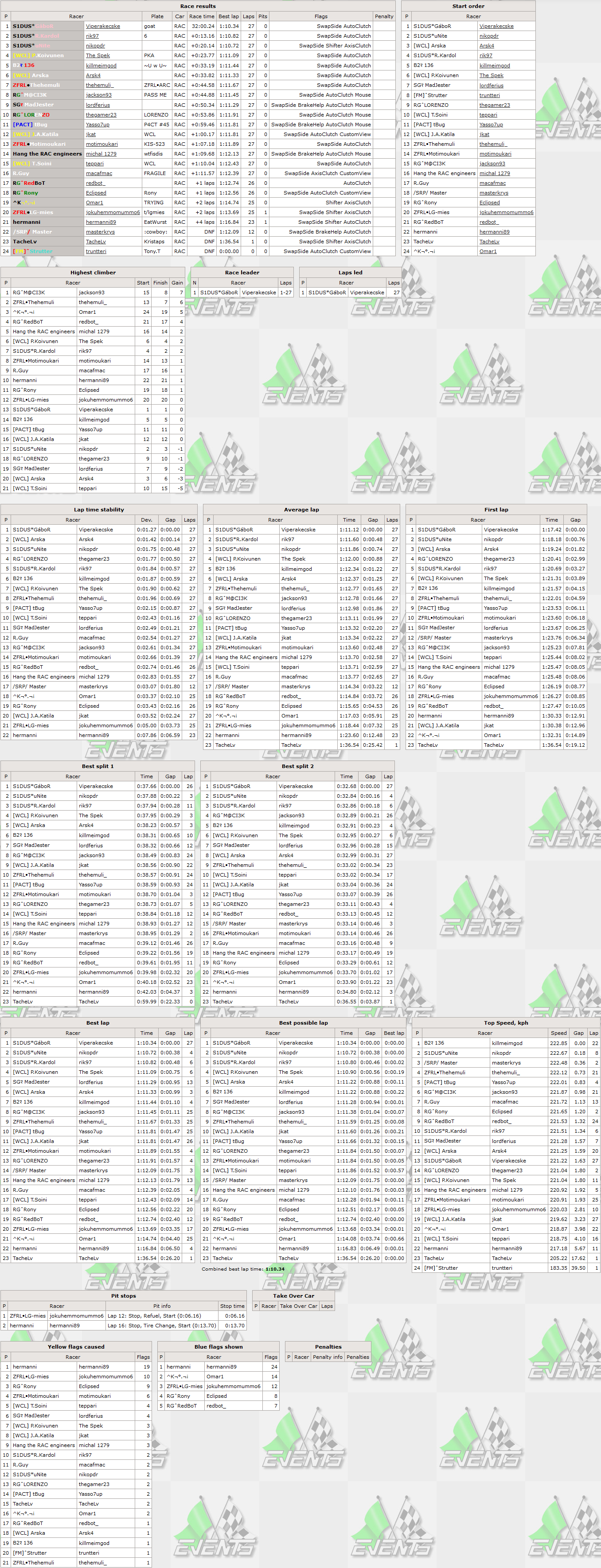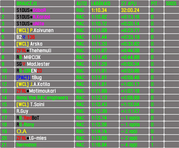 Gábor in this race started 2 winning streaks - he was previous winner in both overall last race and also last race with this car. He was unchallenged through whole evening and besides setting new world record in this combo earlier in the evening,gathered up all the achievements from this race by leading all 27 laps (with this exceeding 700 laps led mark) and finishing with 13 seconds gap. It was the hungarian's 34th RTFR race win (just 2 less than all time leading number set by Botsi),28th pole position,30th fastest lap of the race (all time most) and 61st top5 finish. Rest of the podium was taken by winner's teammates - R.Kardol was the better one finishing 2nd and scoring his 94th top5 finish,Unite was the better one in qualifying,but was demoted to 3rd place in results - 81st top5 finish for the finn. The 2nd finn in top5 with race running finnish made car was P.Koivunen in 4th place - that is his 7th top5 finish,2 positions better than his best result in this season,top5 was closed by driver with 3 numbers in his name,who scored his 2nd top5 finish 4 weeks after his 1st.