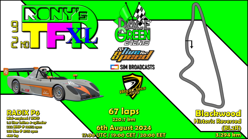 If broadcaster can comment the action on track from a car,I thought I could post results while travelling the ship - sadly the network connection in international waters is quite poor,so the results are posted just now... The quite radical small racing car was run in the rather unradical Blackwood this week and that for 75 minutes,which is not really something you usually see this car's counterpart in real life. But this is LFS and we race everything that's worth to do it and 25 racers were around to try their skills and luck,however only 23 of them were standing on grid.