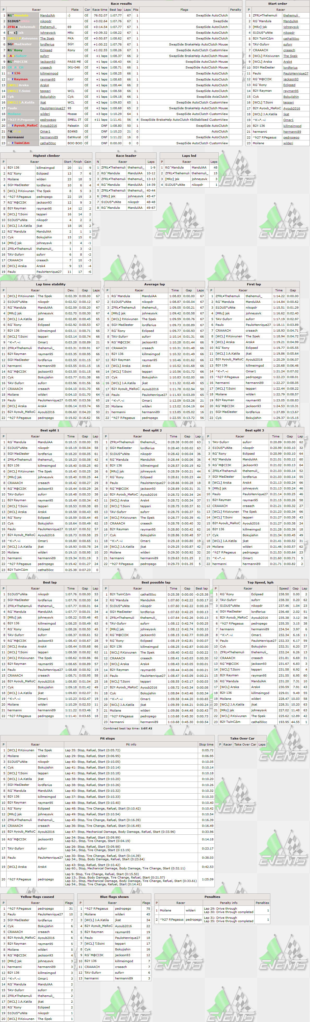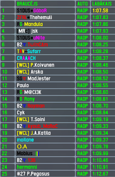 With 2 race winning streak Gábor joined and seemingly set his sights on 3rd in row as he was the fastest in qualifying scoring his record breaking 12th pole position in RTFR XL. However he denied joining the grid and gave up his winning streak voluntary. With 3 winless drivers taking the top3 spots on grid,there were some thoughts of a first time winner in this race - Mandula repeated his best qualifying effort (3rd position) this week and on lap 10 took over the race lead to apply himself for race win. After some early struggles and also late battle he established himself in race lead,keeping it over the finish line to score his 1st ever RTFR XL race win,extending winning streak for Hungary to 3. It was his 8th top5 finish and an 2 position improvement compared to his previous best result,while also the 2nd race which he led (previous was 60th RTFR XL). The only previous winner in the top5 was Unite - he also had some chances for race win,however could lead just a single lap and eventually finished 2nd,officially scoring the 150th top5 finish for Finland and 28th for himself. During the chase for lead he set also the fastest lap of the race,that's his 5th already. Thehemuli seemed to be the number 1 candidate for his 1st win early in the race,however he was not able to keep up the needed pace and after leading his first 15 laps in RTFR XL,he settled for 3rd place finish,only repeating his best result - 2nd place in qualifying was an improvement by 2 positions. It was 3rd top5 finish for the finn,who set total count of top5 finishes of finnish drivers to 151. Also 4th place finisher Jsk had his best RTFR XL race - the 4th place in qualifying was an improvement by 5 positions,the 4th place finish was the better one of 2 top5 finishes and also he added himself to race leaders list with 3 laps. Top5 was closed by Madjester,who repeated his best result achieved last race.