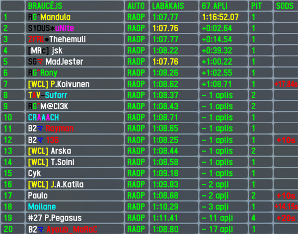 With car's fuel tank being able to take the car just over 2/3 of the race,it was clear that everyone will need pitwork,most of them refuelling and then waiting for 10s mark to leave pitlane - so it was an indirect pit clocker competition this time. Best of them was mr. 9.99 himself - Unite with a 10.05 seconds pitstop.