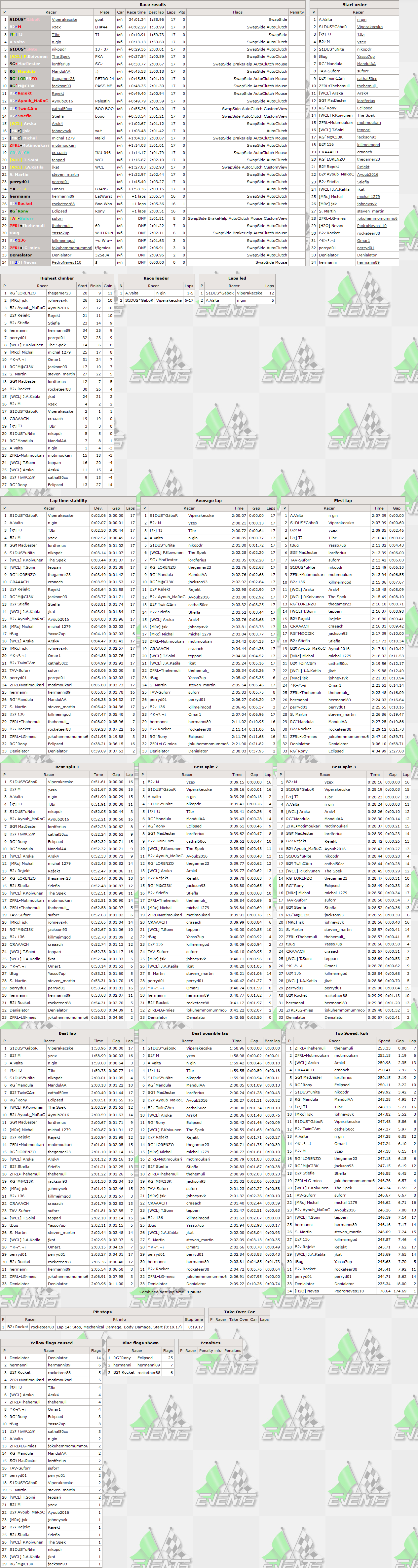 Gábor returned to RTFR after missing 1 race and started the return of being fastest driver in practice. Even if he was outpaced in qualifying,after chasing the polesitter for 5 laps,he used rival's mistake and slipped into race lead,leading rest of the race to become all time most successfu driver in RTFR as the hungarian scored the record braking 37th race win. Additionally he scored his 32nd fastest lap of the race (already all time highest) and 65th top5 finish. The 2024 season 1 champion M joined his first race in the 2nd season and started with a 2nd place finish upgrading his 4th place on the grid - that's 23rd top5 finish for him. Despite having some position trades during race,TJ finished in same position he started - 3rd,rounding up his top5 count to 10. Current standings leader was the fastest in qualifying scoring his 9th pole position,however A.Valta's race went south after mistake in lap 5 as it was the start of his positions regress,which ended in position 4 - also he scored his 23rd top5 finish. 5th place in both sessions was taken by Unite,who scored his 84th top5 finish (still 3rd most).