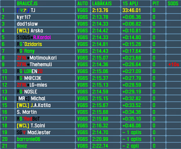 The 2nd road tyre car race in row was won by brazilian TJ,who late in qualifying session set the fastest lap,but lost it moments later,earning the outside position of front row. But his start was significantly better than polesitter's and after few battles in early laps,he established his race lead with an increasing gap to competition,crossing the finish line first to score his 3rd win in this season and 4th win overall,setting also fastest lap of the race,which is his 3rd. TJ scored his 12th top5 finish and led all 15 laps in this race,which is 5 more than in his previous 3 racewins together. Kyr1l was the fastest through most of the qualifying session,but was demoted to 3rd late in qualifying - that's still 7 positions better than his previous best qualifying result out of 4 tries. In the race he tried to challenge the leader few times,but eventually had to concede,finishing 2nd 6 seconds apart from race winner,improving his only previous finishing result by 18 positions. Also Dod1slaw improved his previous best results by some margin - his 6th place in qualifying was 3 positions improvement,during the race he progressed up to 3rd position in finish to reach 4 positions improvement for his best finishing result. Arska beat the best result very late in qualifying and scored his 3rd pole position in RTFR,but with high 1st gear saw competition flash by at start,losing positions not only on start but also later in race - 4th position for the finn is a repeat of his season best result and 33rd top5 finish in total. The winner of previous race R.Kardol qualified 5th and had to pass many cars to regain that position in finish as he managed to get involved in few incidents early on,still increasing the all time leading top5 count to 96.
