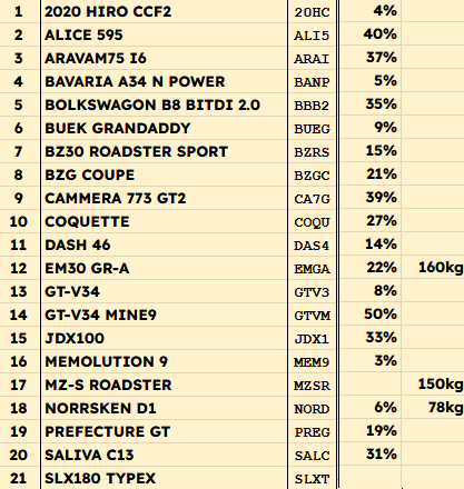 RandomCar test race cars list in spreadsheets: LINK