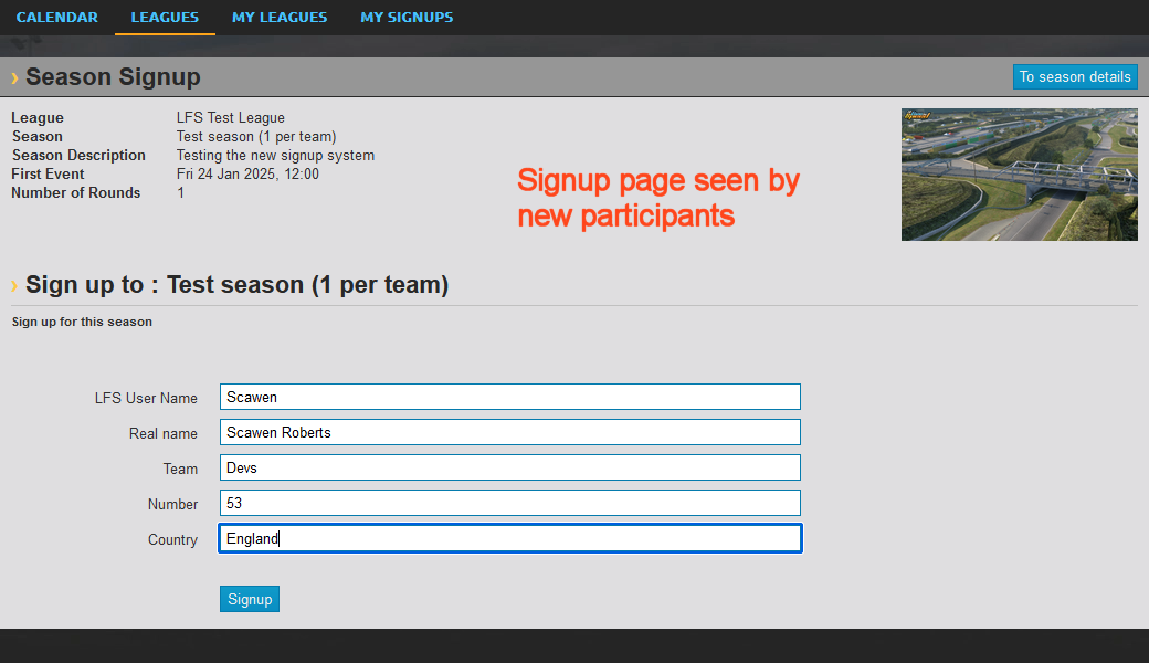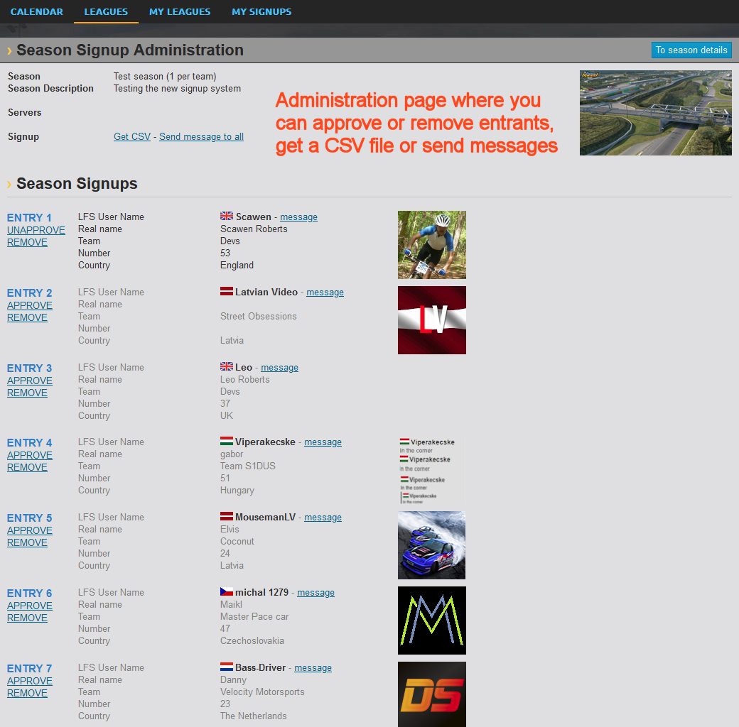 Quote from Scawen :Skin packs are now available. I think maybe it should only be for administrators but I have enabled it on the public page for now so you can see and test it. https://www.lfs.net/leagues/22/season/1219/signup/view