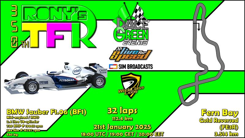 Once in a while RTFR offers something a bit more difficult and this tuesday the challenge was a ridiculously fast car in a lower grade track - Fern Bay. This race was all about consistency in fast paced race,where each smaller mistake could turn into quite a disaster and racing close together with others just increased the chances for disaster to happen. 24 drivers started the race and we lost almost 40% of them due retirements of different kinds during the first 9 laps,however the remaining 15 drivers kept running to finish the 32 laps race,or for most - 31 laps race,some even one less.