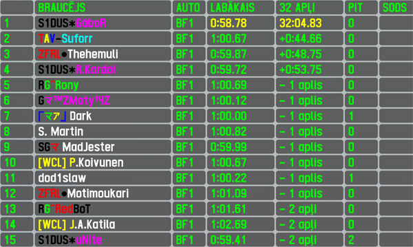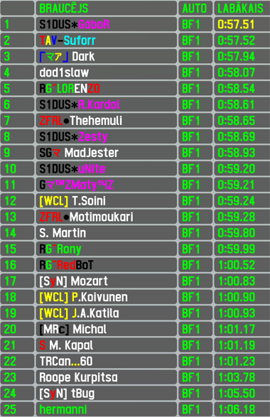 With a record of 2 wins out of past 2 races run with the BF1,Gábor entered this race as main favourite,clocking the fastest lap in qualifying to score his 37th RTFR pole position - that was just a start of his success this tuesday as he led every single of the 32 laps during the race,tying Botsi for all time most laps led count already after 1st one and overtaking him after completing 2nd. With this he scored the 40th RTFR race win,taking also the fastest lap of the race home - his 37th,adding also 73rd top5 finish to his stats. Suforr tried to challenge for pole position as he set a laptime just 1 hundreth away from pole position time,earning his 1st ever RTFR front row start (previous best was 3rd position in qualifying),however he lost a position early on just to regain it later - also the 2nd place finish is his best ever result,improvement by a position and 4th top5 finish overall. Thehemuli had some struggles early on,however found pace later and even tried to catch 2nd position,but simply run out of laps and finished 3rd,scoring his 16th top5 finish. Also R.Kardol had some positions regaining to do and finished 4th and last on lead lap to score his 99th top5 finish,while another RK finished 5th just behind race winner to score his 87th top5 finish,first after more than one year break.