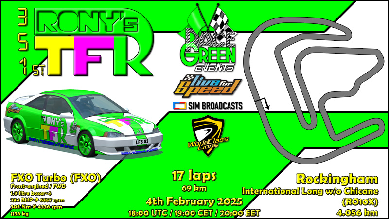 Next tuesday RTFR will be traded for RandomCar - the new season of mixed cars racing will start in South City,full round information will be posted during the weekend. In 2 weeks RTFR will return with one of the slick tyres car,some details about combo were announced during broadcast,while in 3 weeks RTFR XL will feature relativelly classic LFS combo with FO8 at Kyoto.