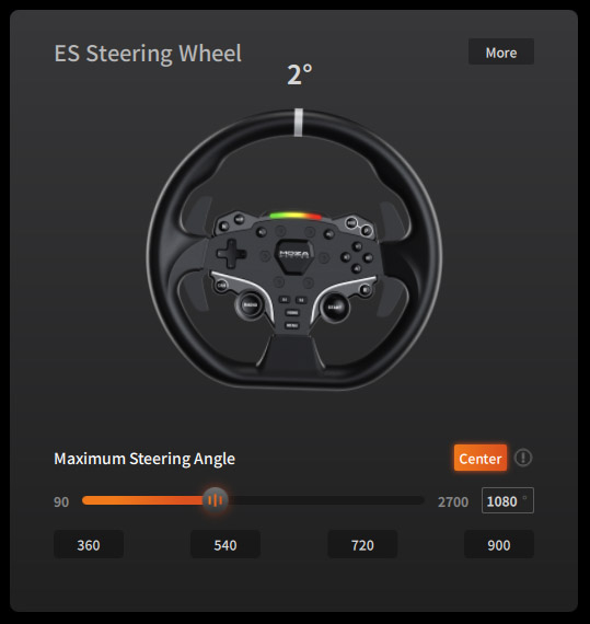 The wheel turn compensation set to 1.00 (max) makes sure the physical wheel turn always matches the in-car steering wheel, provided that the max is set to at the actual max angle or more.