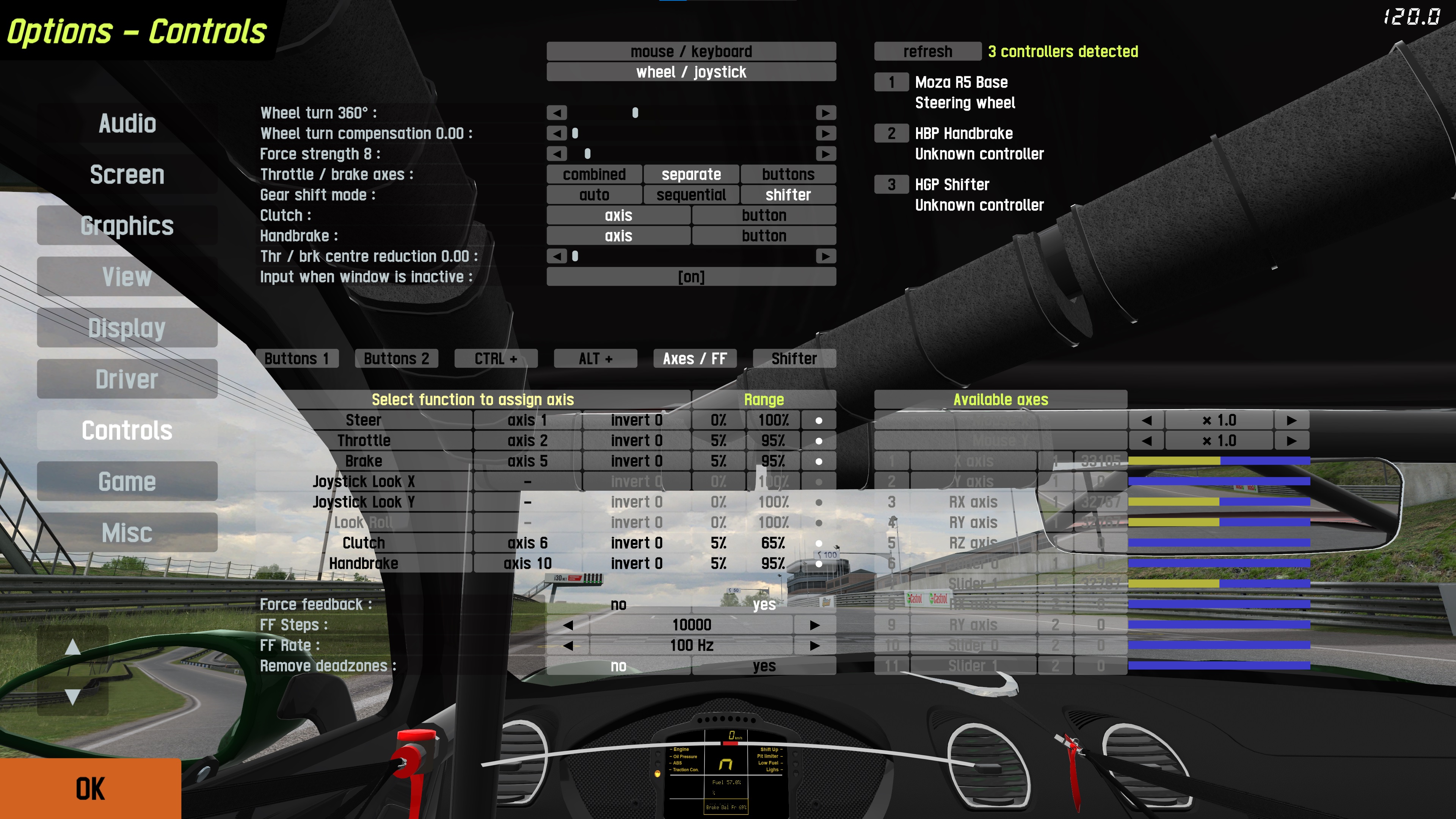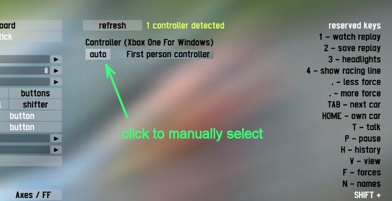 The ability to manually override the controller type in lfs is all we need. A simple override button + a short description of what it does is enough. We don't need an entire selection of all other types, we just need the one that makes the end-stop forces work, therefore one button instead of a drop-down menu list. For example, your auto button is renamed to override, once pressed the type will be set to wheel. Unpressed will show the original device value from the HID descriptor.