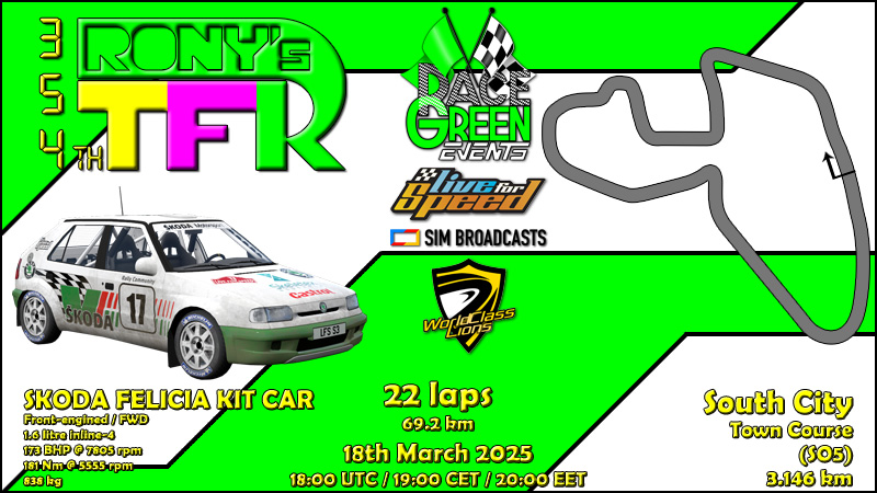 RTFR XL is next on menu and next tuesday it will be quite challenging - a high powered sports car from early 70ies will be run in Aston's configuration with very appropriate name - Historic. The race length is estimated 33 laps,however the lapcount may be adjusted as it depends from polesitter's laptime - full information will be posted this friday. In 2 weeks time normal RTFR will return with one of the street legal cars,as always hints about the combo can be heard during the latest livestream recording.