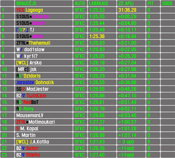 Lagooga wasn't attending RTFR for one year,but yesterday kept doing the same he did before the break - winning,as the lithuanian won both his last attended RTFR race and coincidentally also the last RTFR race in this same configuration (275th RTFR 3 years ago,running with LX6). Yesterday he was the one to beat,however his advantage was really small - he earned his 19th pole position (tied 4th most) with just 0.03s advantage and despite leading all 22 race laps (with that exceeding 200 laps led mark),he finished just 0.29 of a second in front of closest rival,still adding the 10th race win to his stats,while his top5 count now is exactly the double of wins - 20. R.Kardol qualified 3rd,but quite soon climbed up to 2nd position in race,eventually reducing leader's gap under 1 second,clocking the all time 16th closest finish 2 weeks after he was in front of 18th closest finish (now 19th). The all time top5 finishes leader added the 102nd top5 finish to his stats out of 120 overall race finishes. The 15 race rating and current season standings leader Gábor was very close to fastest laptime in both sessions,however could not pull the best out of this car and settled for 3rd place finish,scoring his 77th top5 finish. The brazilian TJ was 4th in both sessions to score his 14th top5 finish,Unite managed to steal the fastest lap of the race in last lap,scoring his 27th of those (still all time 3rd most),but finished just on tale end of top5 to add 94th of those to his stats.