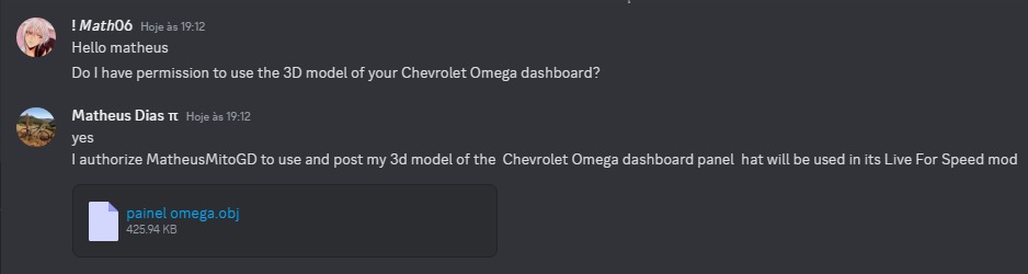 I authorize MatheusMitoGD to use and post my 3d model of the Chevrolet Omega dashboard panel hat will be used in its Live For Speed mod