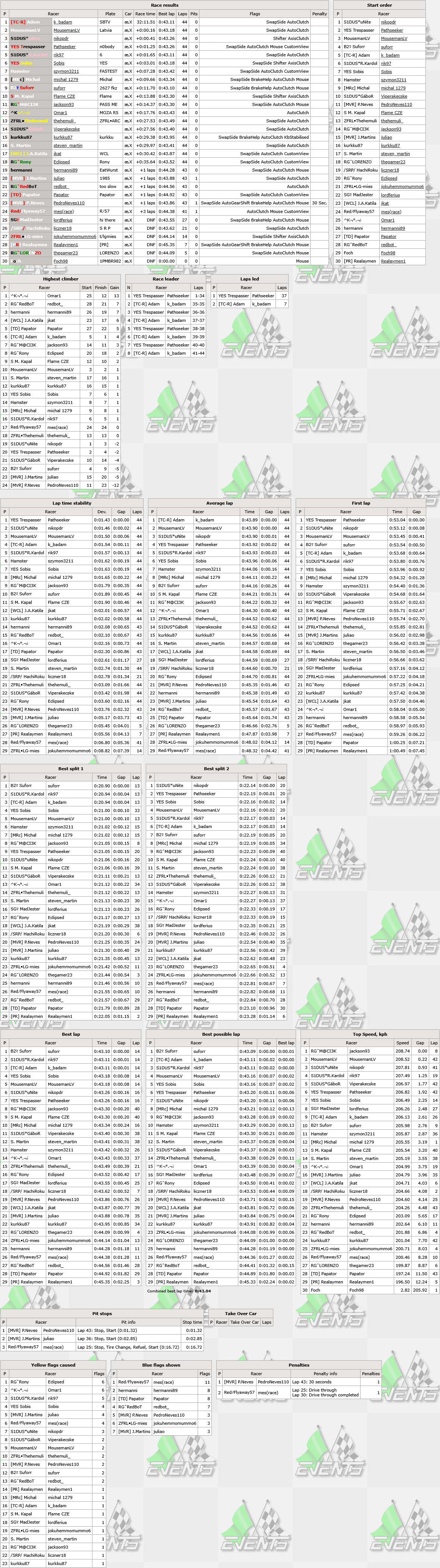 The very first RTFR race in Rockingham's oval went into history for the closest finish in RTFR history and first ever (and until now also the only) race win of a Scottish driver. If the first entry in record books was not really endangered, the 2nd one received an addition - Adam started the race from 5th position and spent most of the race in lead pack, led 7 laps from last 10 to escape from chasers and cross the finish line first for the 1st time in his 39 races long history in the event. The previous best race result for him was 3rd position and it was the 8th top5 finish. MousemanLV repeated his best qualifying effort (3rd) and also spent the race in leading pack, during last lap he was one of the chasers, but run out the distance to pass for lead,so he had to settle for 2nd place finish which is still 2 positions higher than his previous best result, adding 3rd top5 finish to his stats. The bumpdrafting during qualifying worked well for Unite as he set the fastest lap in session to score his 11th pole position, however he never led a single lap and also last lap dash ended with a mistake in last turn, which demoted him to 3rd place in finish - that's his 95th top5 finish. Trespasser is a rare visitor in RTFR - it was just his 3rd event, but once again he qualified 2nd, led his first 37 laps, but was not in contention for race win in deciding phase of race, finishing in top5 for 2nd time. R.Kardol closed the top5 to score his 104th top5 finish and to delete almost 1/3 of his gap to standings leader. One more driver is left to mention - the owner of fastest lap of the race. Suforr scored his very first of those for himself and also for Spain when being part of the leading fast pack - interestingly all 5 fastest laptimes of the race were set in the 14th lap.