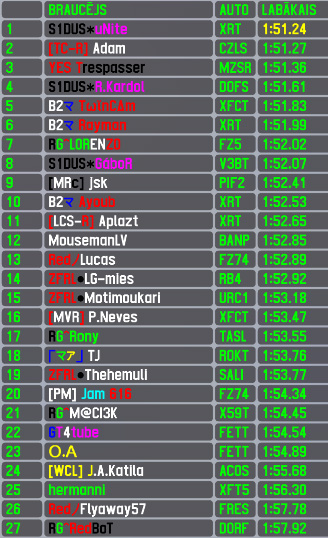 Only 2 cars got new best results - the obvious one is Trespasser's 3rd position in qualifying and race win,beating Rony's previously set best results (accoringly 9th and 10th positions). The other one is R.Kardol's 4th position in qualifying with Dorito FD7 SR,which is 2 positions better than previous best shared by Dodislaw and Mouseman,however his 4th position in race is just a repeat of best result.