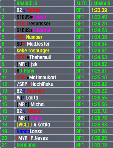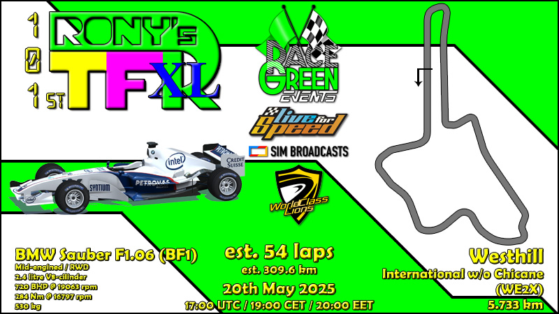 The 1st RTFR XL race of the 2nd century was run with the fastest standard LFS car BF1 in a soon to be standard configuration - the Westhill International without last chicane. Since making it standard will take a while,we have to make it ourself first using open config method. The fast BF1 with it's specific handling as always was a challenge for drivers,for some big enough to not even try - with 21 attending drivers this was not the least popular race of the year,but being around all time average values means lower attendance than in latest few years.
