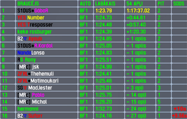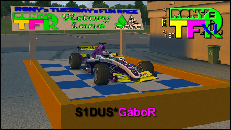One week after celebrating his first ever RTFR race win,Suforr scored his own and his country's first pole position in the other RTFR series,setting sights also on the other winners club. However he was passed very early in the race and led 10 laps in 2 pitstop shuffling phases before retiring after spinning the car 2 turns after completing half of the race distance. The driver who has won 8 of latest 11 RTFR XL races incresed his winning percentage to 75% after this race - Gábor once again was the driver to beat,this time leading 42 of 54 laps and finishing 44 seconds ahead of competition to score his 17th RTFR XL race win,picking up also his 17th fastest lap of the race and 27th top5 finish. A driver with a win with different F1 car in RTFR XL was the best of the rest this week - Number also took over race lead for 2 laps during pitstops shuffling,but was no danger for race win and finished 2nd to score his 5th top5 finish. Trespasser scored his best qualifying result 3rd,improving the best result by 1,but could not find any way to upgrade the position during race and scored 3rd position also in race results,which is his 2nd top5 finish. Last on the lead lap was a driver who decided to opt for a funny name for this race - mr Puntola scored his 31st top5 finish. Despite losing a lap,Ayoub still managed to clinch a top5 finish,which is the 9th for the maroccan.