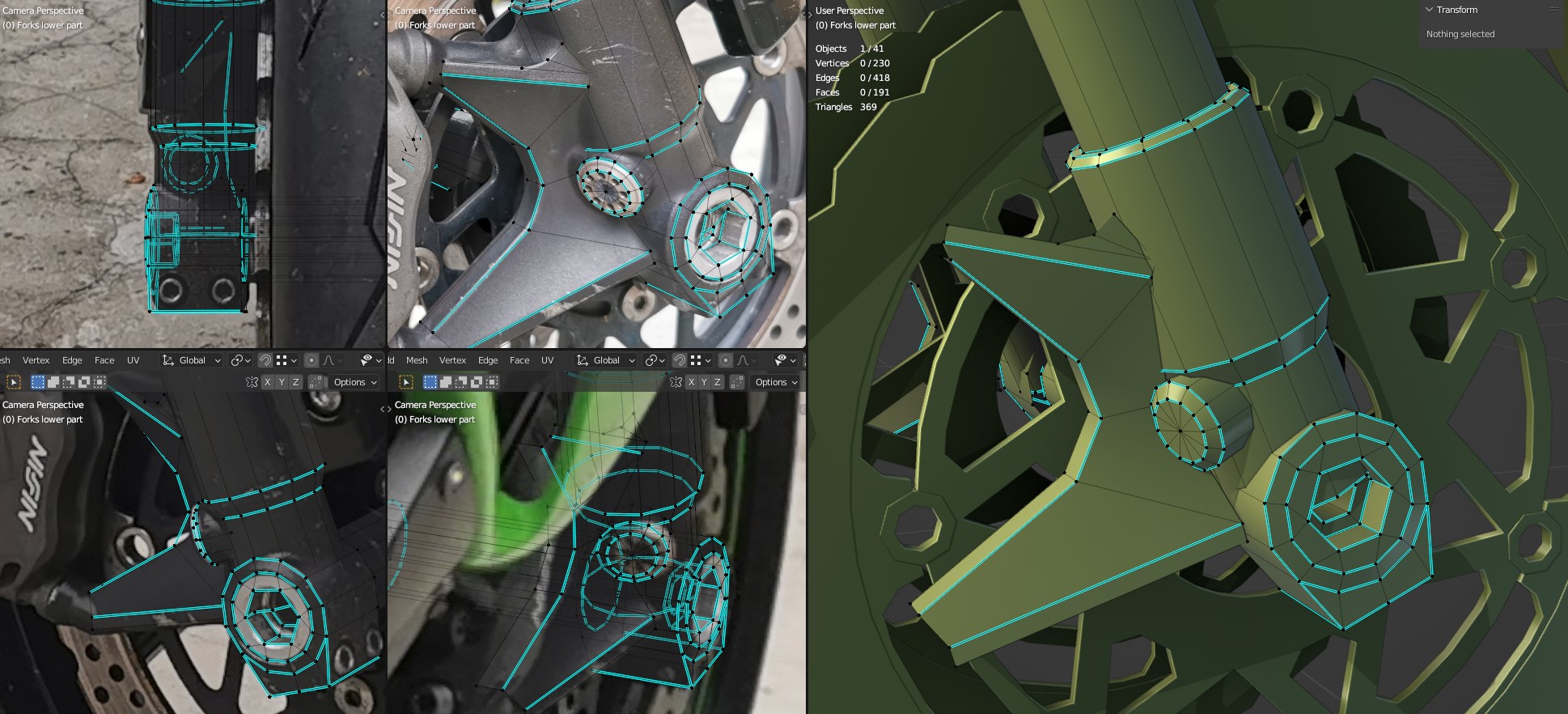 The way i started modeling my bike was that i took a lot of photos from all sides (over 500) and then used a photogrammetry software to make a rought model out of them. Then exported the mesh with cameras into blender.