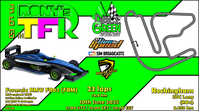 This is actually one of few real life combos possible in LFS - the entry level Formula BMW FB02 in now defunct Rockingham Motor Speedway,which was the car's 2nd ever visit to this environment,this time running in 3.25 kilometer ISSC Long configuration. Despite lack of the cirtual camera crews around the circuit,taking care of event promotion,this race still gathered 29 drivers in qualifying and all of them also started the race - even if this is more then all time average attendance,it was still the least attended FBM RTFR race from the latest 5 with this car.