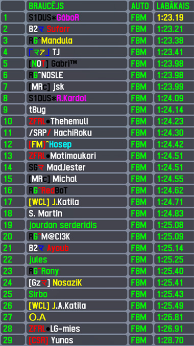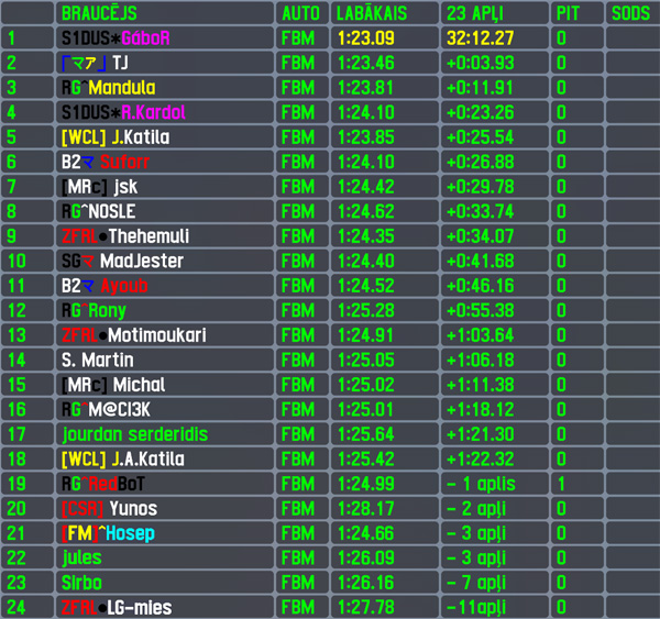 Regarding top of the field,this was just a confirmation round to rest of the season - Gábor was already announced as season standings winner before last round of it,but he continued where he left of - winning yet another race after leading all laps,which is his 6th win in 12 season rounds and 44th in total and 50th race win for Hungary. Just by a 1/50th of a second the hungarian scored also his 43rd pole position and by setting a new server laptime record - also his 41st fastest lap of the race,adding also 82nd top5 finish to his stats. His well known rival TJ had to start from outside of 2nd row,but he found way to pass 2 cars and finish 2nd almost 4 seconds off race winner,scoring his 15th top5 finish. After missing 19 RTFR races,Mandula finally marked the milestone of starting his 100th RTFR race and celebrated it with 3rd position in both sessions (repeat of best qualifying result),scoring his 23rd top5 finish from 95 total finishes. The 2nd best driver of the season R.Kardol could not find common language with this car for high results,still gained 4 positions during the race to finish 4th and score his 106th top5 finish,soon in finish followed by J.Katila in 5th,to score his 27th top5 finish.