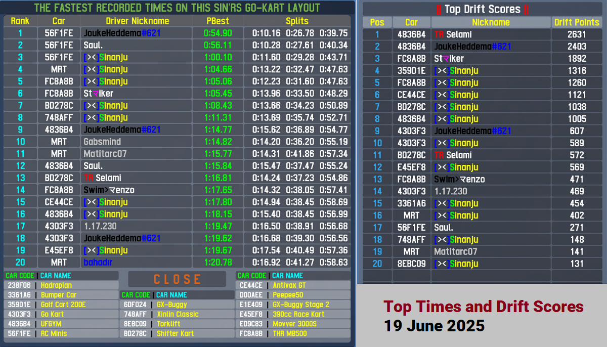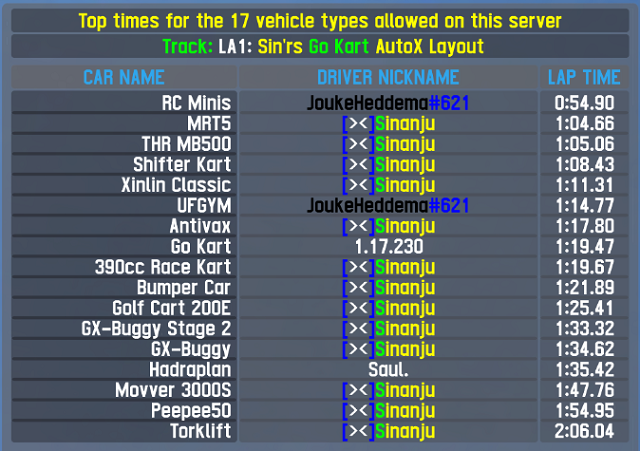 There are 17 vehicles to choose from to try set a hotlap - the MRT and 16 mods. These are go karts and other small vehicles.
