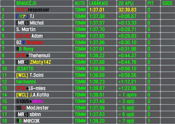 Even if technically this is 2 wins in row,it won't really go into history books - just a week after celebrating his 1st race win in RTFR XL,Trespasser joined also winners club of normal RTFR. The lithuanian was pretty much unchallenged this tuesday - he scored his 1st RTFR pole position in qualifying (just a position better than 4 races ago),led almost every single meter of the race to finish as winner with 6 seconds advantage over closest competitor. Trespasser is the 82nd race winner in RTFR history,3rd new one in past 2 months,he also scored a fastest lap of the race for the first time and his 3rd top5 finish. Just like race winner,also 2nd place finisher TJ set a laptime in race that was quicker than best laptime in qualifying session - the brazilian was able to improve himself from 5th position on grid to 2nd place in race finish,which is his 16th top5 finish. Michal followed the 2nd place finisher and also upgraded his grid position by 3 positions in race finish to repeat his best RTFR race result - 3rd position,which is his 14th top5 finish,2nd in past 3 races. S.Martin obviously found his best car as he improved his best results massivelly - the 2nd place in qualifying was 12 positions better and 4th place finish was 4 positions better than his results in previous 34 attended RTFR races. Top5 was closed by one of the newest additions to winners club - Adam made 4 positions progress to finish 5th and score his 9th top5 finish.