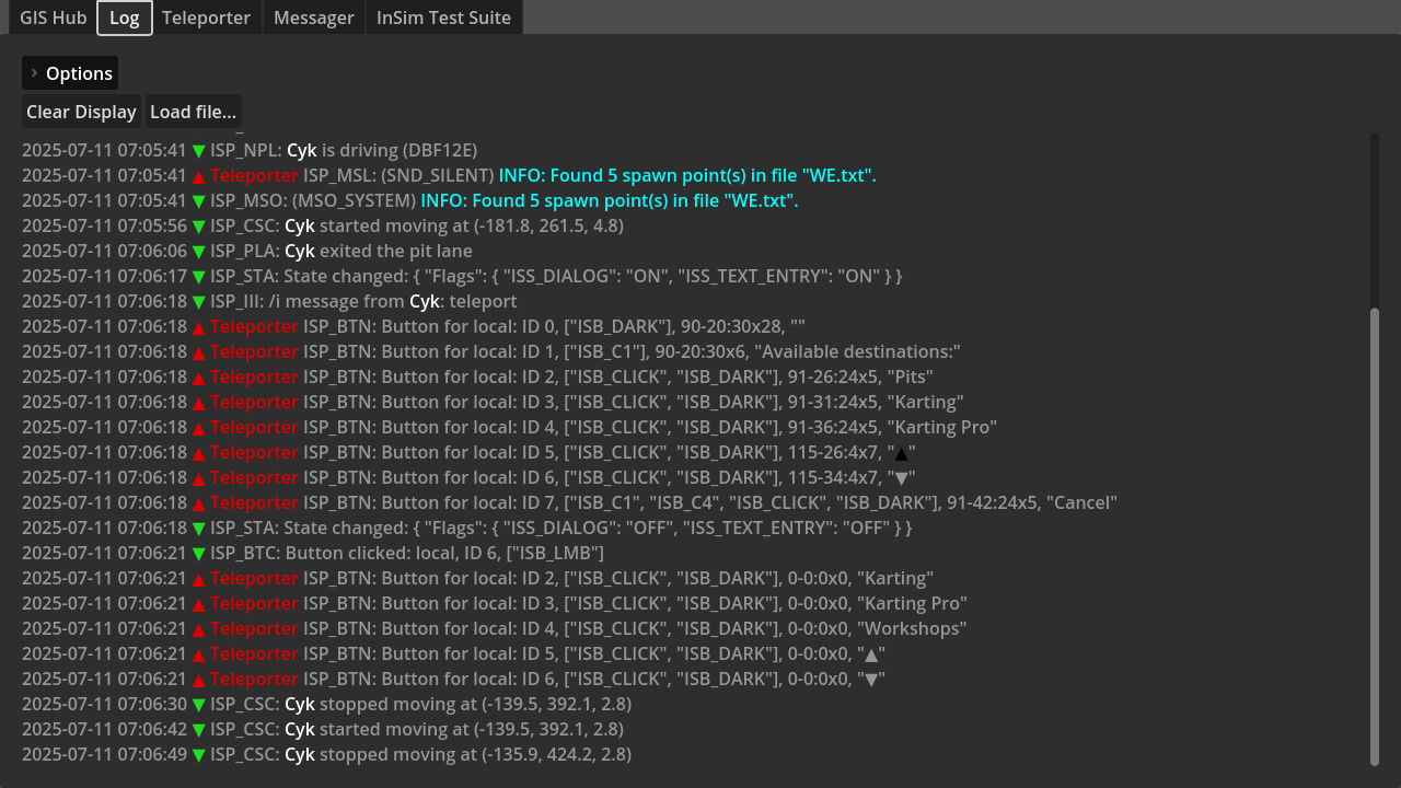Log: [Core] This module displays all InSim packet traffic, including timestamps, packet direction (and the sender module if relevant), and a human-readable version of the packet contents (which may omit some data, depending on the packet type). It also creates a log file with the full data for all packets, and allows loading such files back into its GUI for easier reading.