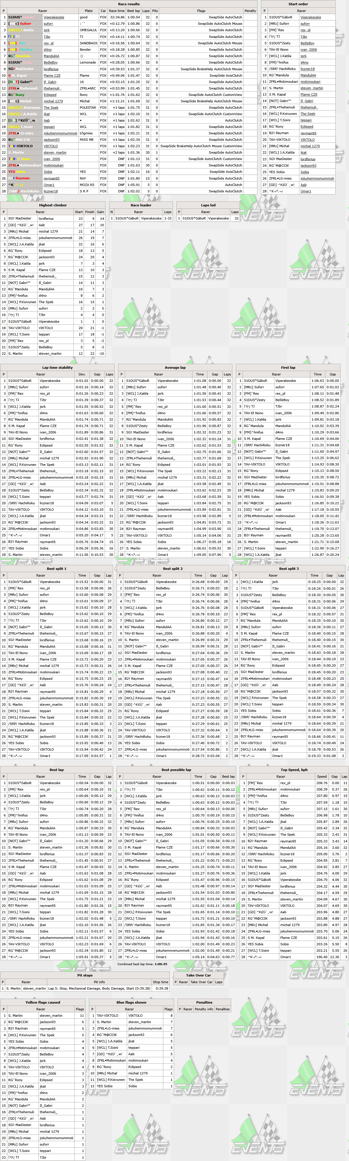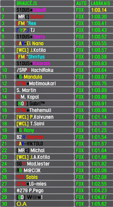 After the 3 unattended off-season races,Gábor returned to RTFR and did what he did many times before - put his name on top of all tables,scoring more achievements to his account. The hungarian was fastest in qualifying to score the 44th pole position for himself and 50th for Hungary (2nd country after Finland to reach this number). He kept the race lead after few competition attempts and run away from everyone to finish 12 seconds ahead after leading all 32 race laps,increasing his all time lead laps count to 993,so only 7 more needed to reach 1000. This was Gábor's 100th RTFR race finish,from which 45 he has crossed the finish line as race winner,scoring also his 42nd fastest lap of the race and 83rd top5 finish. The number 2 of this round was Suforr,who qualified 2nd (repeated personal best result) and despite being chased closelly by several drivers also finished 2nd to score his 9th top5 finish. Only 2 previous FOX race winners attended in this race,the other one besides Gábor was J.Katila,who finished 3rd from 7th position on grid,scoring his 28th top5 finish. Rest of the top5 was filled also by experienced FOX drivers from other series - 4th was TJ,scoring his 18th top5 finish,5th was the only winless driver of RTFR in today's top5 - Rex finished in top5 for the 2nd time.
