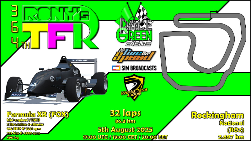 RTFR 2025 season 2 started with the classic LFS mid-range formula car FOX,run in the longest configuration of Rockingham that does not use any sections of the oval. This created a fast paced racing,where drivers could press the trottle to max for majority of the track with only few rather short braking zones. Season opener raised the attendance numbers again - with 30 drivers this was the most attended race since other race in Rockingham in end of april.