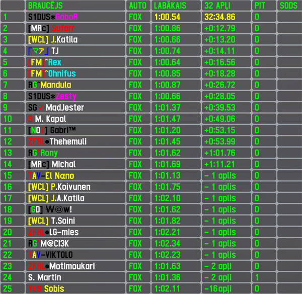 After the 3 unattended off-season races,Gábor returned to RTFR and did what he did many times before - put his name on top of all tables,scoring more achievements to his account. The hungarian was fastest in qualifying to score the 44th pole position for himself and 50th for Hungary (2nd country after Finland to reach this number). He kept the race lead after few competition attempts and run away from everyone to finish 12 seconds ahead after leading all 32 race laps,increasing his all time lead laps count to 993,so only 7 more needed to reach 1000. This was Gábor's 100th RTFR race finish,from which 45 he has crossed the finish line as race winner,scoring also his 42nd fastest lap of the race and 83rd top5 finish. The number 2 of this round was Suforr,who qualified 2nd (repeated personal best result) and despite being chased closelly by several drivers also finished 2nd to score his 9th top5 finish. Only 2 previous FOX race winners attended in this race,the other one besides Gábor was J.Katila,who finished 3rd from 7th position on grid,scoring his 28th top5 finish. Rest of the top5 was filled also by experienced FOX drivers from other series - 4th was TJ,scoring his 18th top5 finish,5th was the only winless driver of RTFR in today's top5 - Rex finished in top5 for the 2nd time.