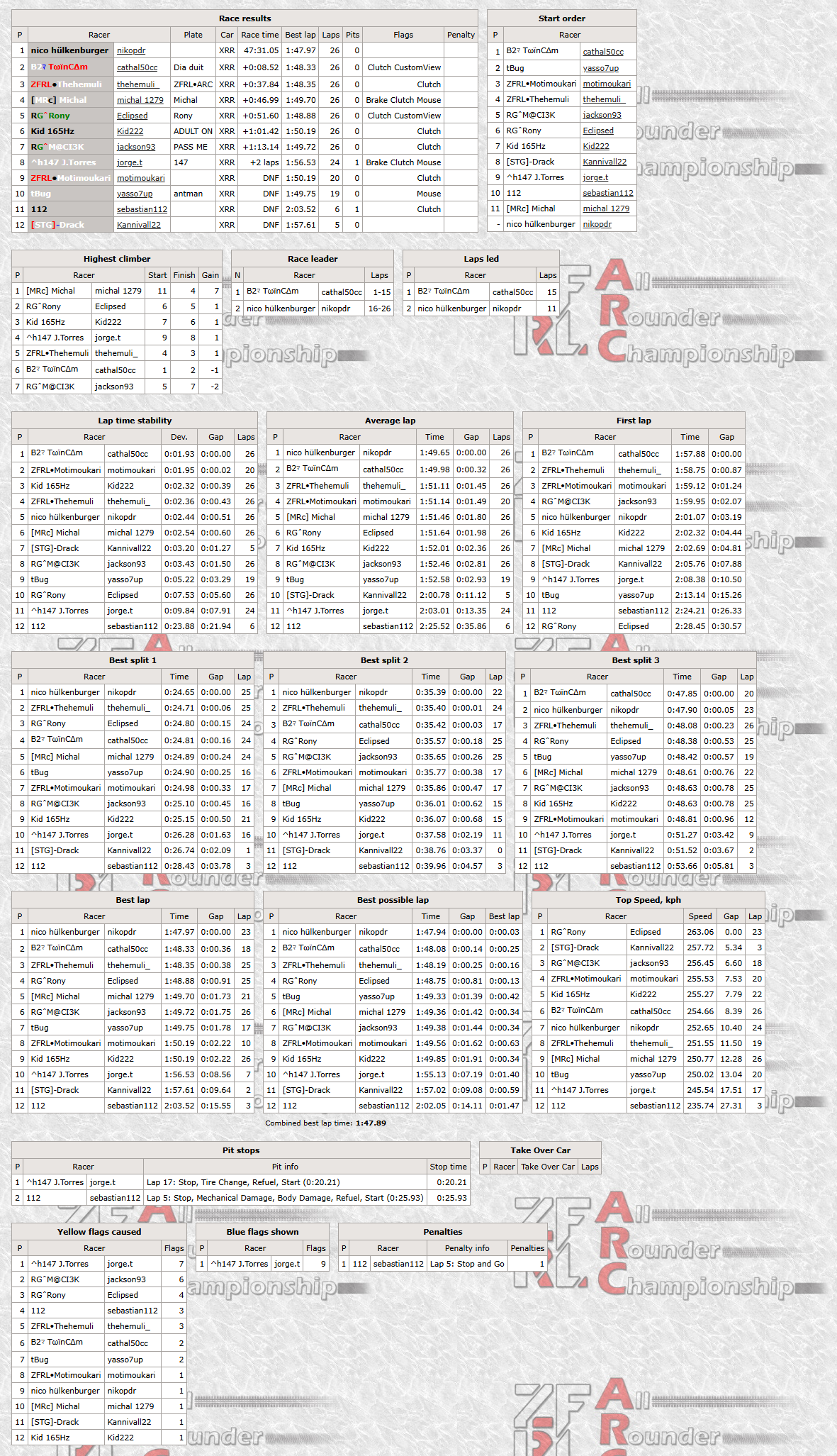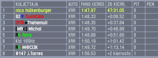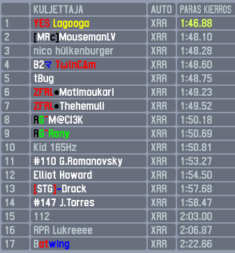 At the start there was drama even before the lights turned green as Tbug jumped the start and was forced to join behind the pack from the pitlane. Unite made some good progress from behind the grid passing three cars at once in T1 and passing Kid at the first split and was in fifth position after that when Rony decided to pay a visit to the barriers ahead of him. Twincam started to pull a steady gap at the front while Thehemuli tried to keep up but ended up overheating his tyres in the process. This led to him losing positions to both Motimoukari and Unite on lap 5, with Unite overtaking Motimoukari too for P2 at the end of the lap. This meant he had 20 laps to gain 5 seconds and make a pass for the win, which he achieved on lap 16 after Twincam made a small mistake. Unite gained a small gap and maintained it until the end, scoring his fifth ARC win. Twincam made his first podium appearance in 2nd place, while the podium was completed by Thehemuli who had an indcident with his teammate who ended up on his roof late in to the race. This incident was reviewed by the race director and was deemed as no further action needed. Top five was completed by Michal in fourth and Rony in fifth.