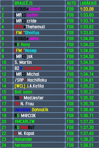 No changes in the winning front compared between this and previous race - Gábor used the combo he selected himself to put his name on top of the day's results once again. In qualifying he was more than half second faster than the best of the rest,scoring his 19th pole position,also in race he set the fastest lap by over half a second which is also his 19th and 23rd for Hungary,tying Lithuania for 2nd most. He crossed finish line 11 seconds ahead of the other driver with lead laps during the race to score his 19th RTFR XL race win and 30th top5 finish. Ohnifus qualified 5th,but progressed up to make this his best RTFR XL performance - he led his first 20 laps in the event series and finished 2nd to score his and also Czechia's best finishing result,improving both by a single position,which is his 5th top5 finish. After 3 5th place finishes in row,Thehemuli had a better race this time to finish 3rd,extending his top5 streak to 4 and total count to 11. Also the other czech driver in top5 scored his best finishing result in RTFR XL - in previous 8 races,M.Kapal was able to score 7th as best result,this week he improved that to 4th. 4 weeks after making his debut in RTFR XL,Cride jumped into top5 finishers list - the finn qualified 3rd,which is 3 positions better than last month,while his 5th place finish is 4 positions better.
