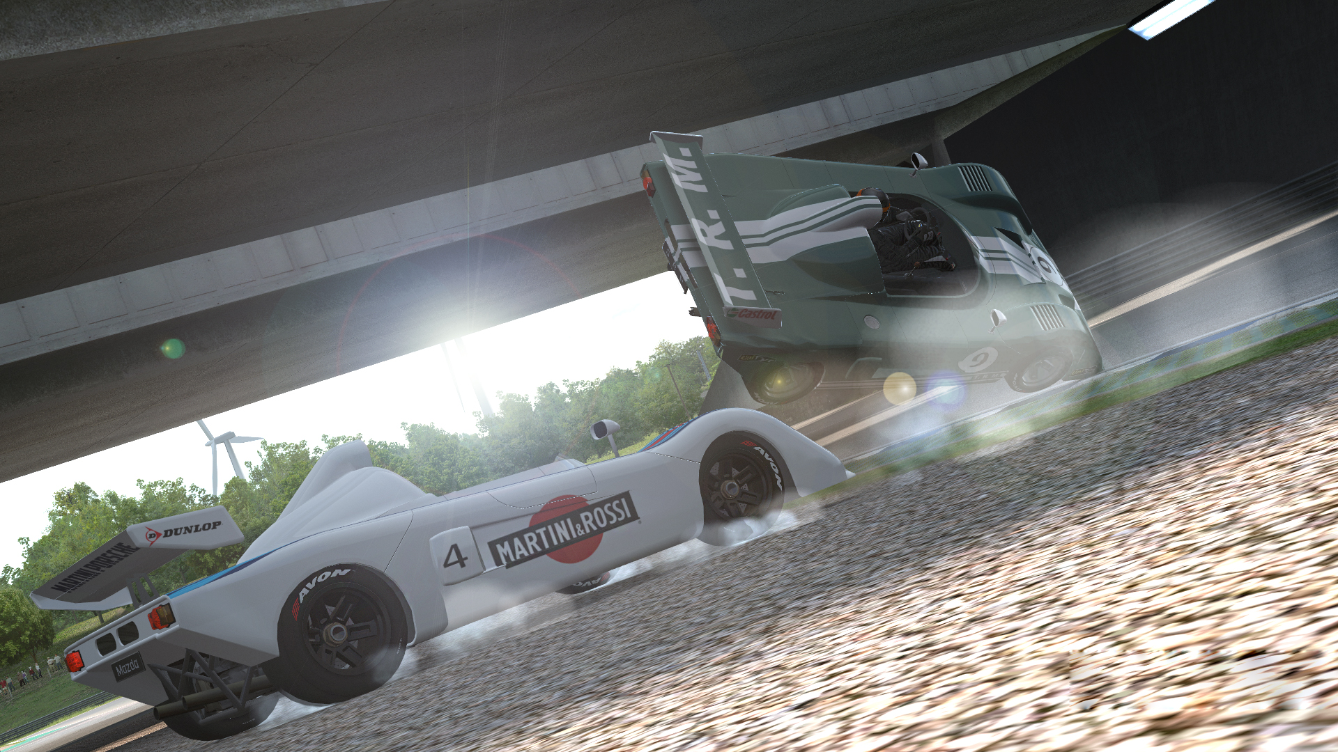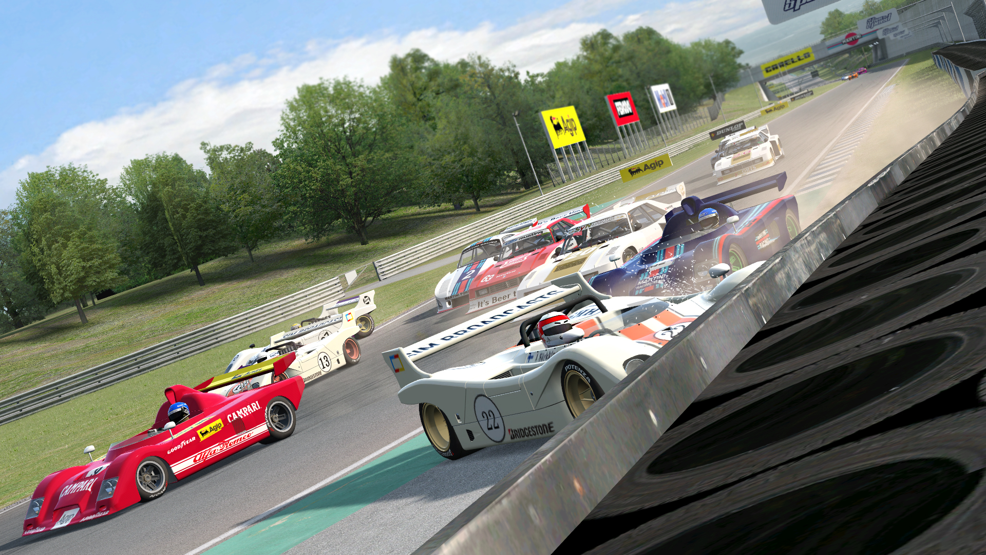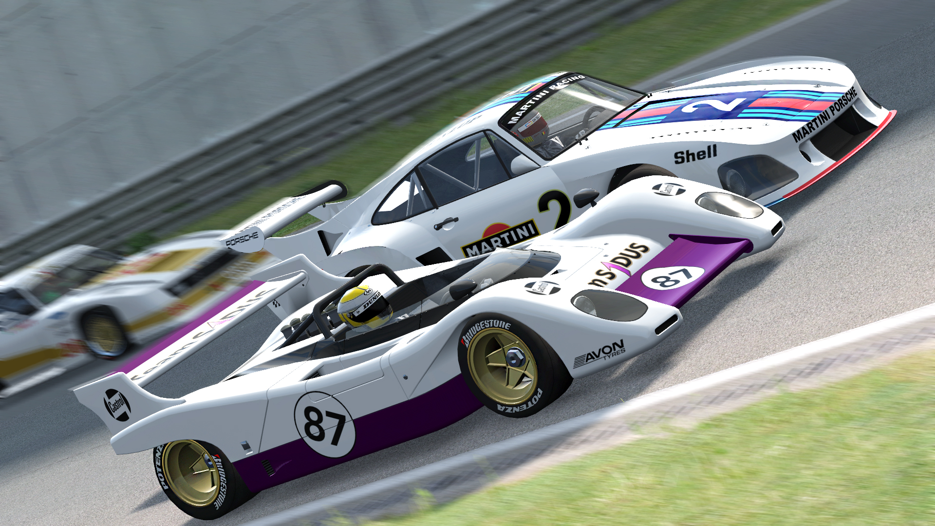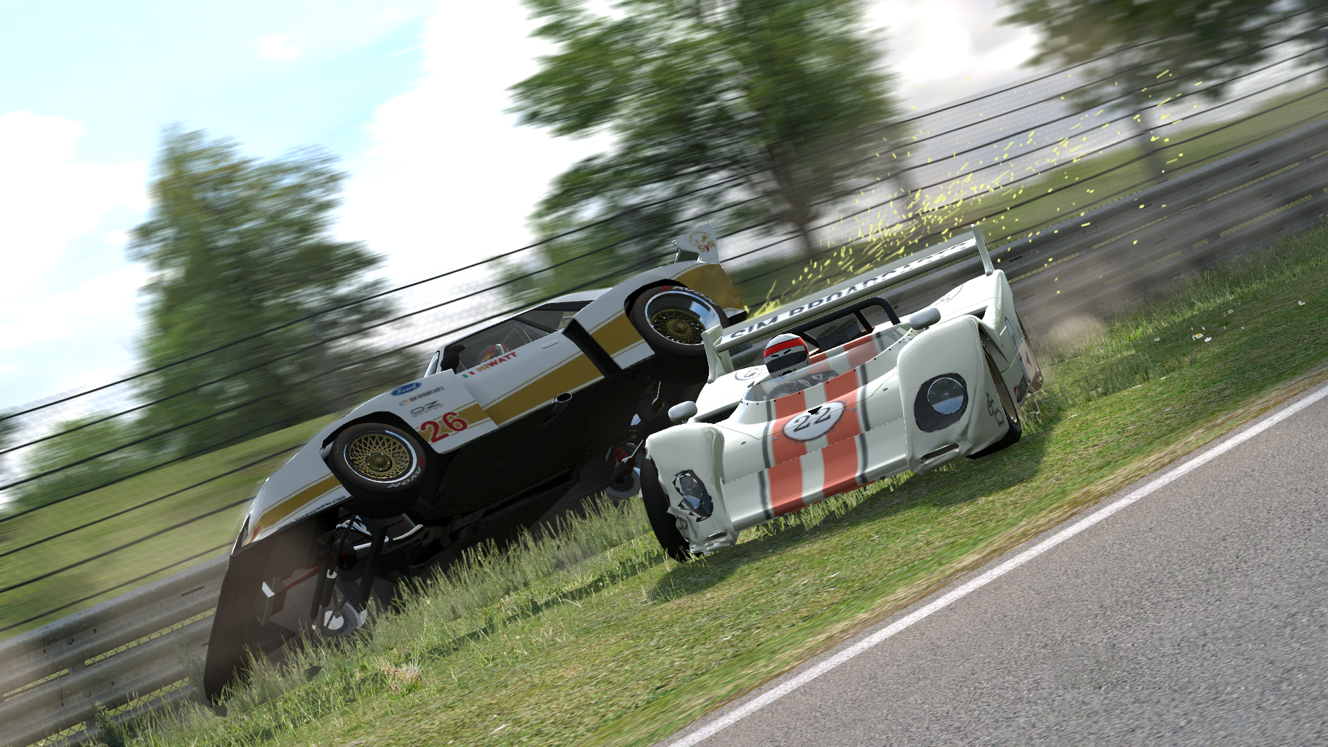 After two corners, TimDC is far too aggressive trying to pass a Prototype and two Group 5 cars on the grass, causing contact and a chain reaction of three cars going into the wall.