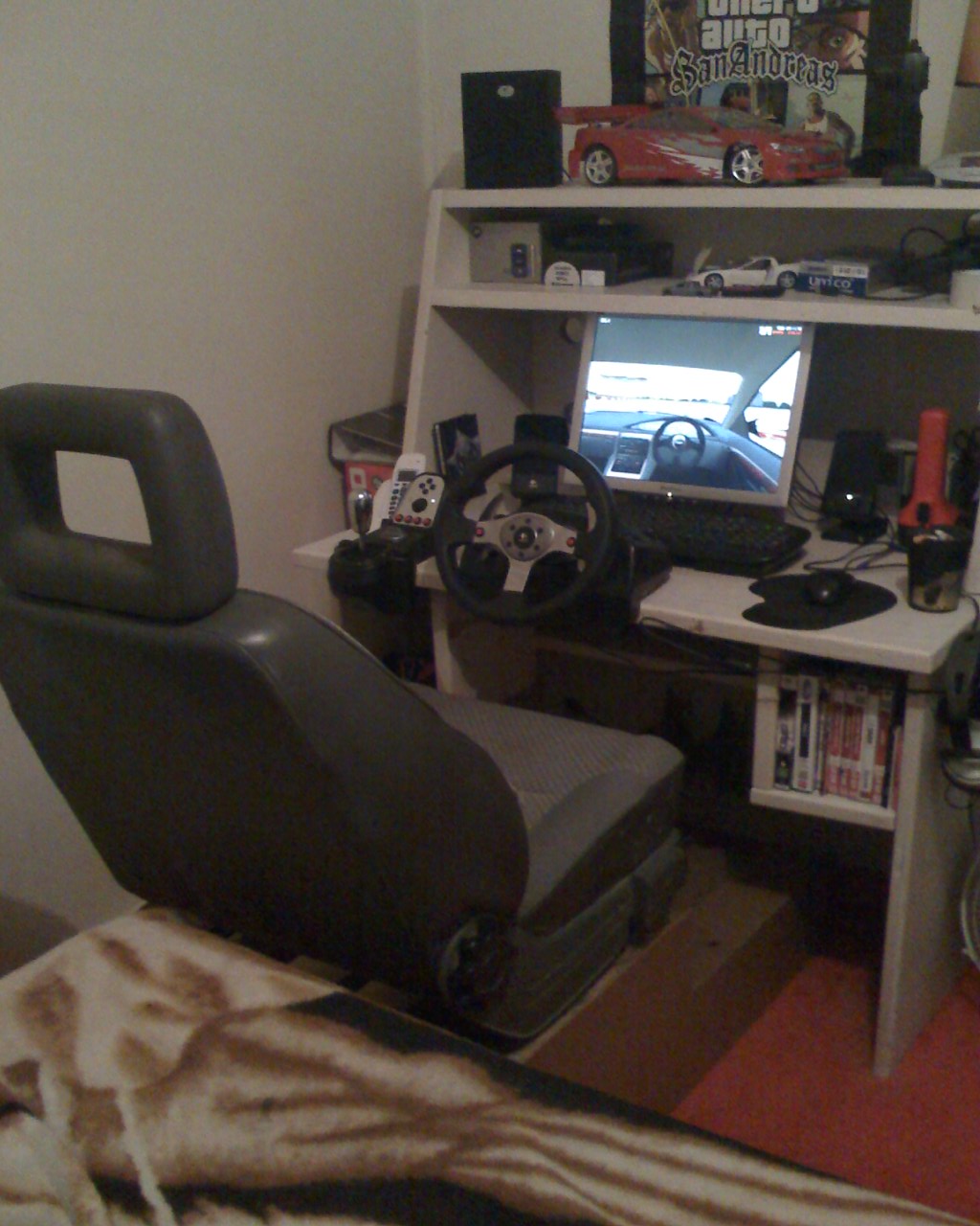 i have a cockpit half built, i have butchered a old wooden Arcade game housing and laid it down - perfect base for a cockpit!