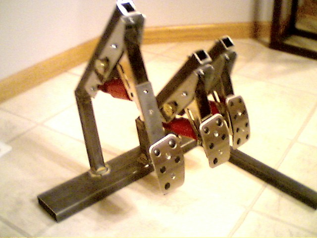 So after a few hours with a cutting wheel, mig welder, and messuring tape, here you go! I wanted the clutch to have the longer throw, like in a real car. I based the pedals measurements off of my RX-8, which has a 2 inch throttle and brake throw, and a 4 inch clutch throw, so that is what this setup now has. I just have to stiffin up the clutch spring now though because of the added leverage.