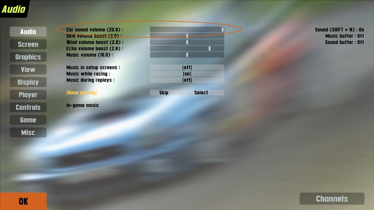 That effects all car sounds (skidding etc + other car's engines as well), to work best with CSR there would need to be a players car engine volume slider so the other cars + skids could still be heard.