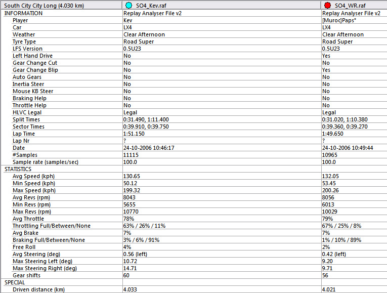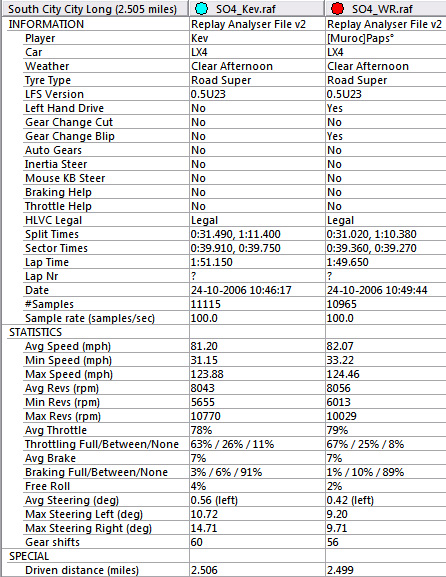 I've included the RAF files of your lap and the WR lap for you to look at, and i've looked and compared lines (in the zips). An image of what F1PerfView says is included (if you want to compare your lines then use Analyze for Speed) of it both in MPH or KPH because i forgot to change it to MPH the first time. As you'd expect your minimum, maximum and average speeds are all slightly lower than his. His minimum revs is 6,000, about 500 more than yours, and his maximum revs are 10,000, while you go 700 higher. He (as you'd expect) steers, and brakes, less than you. He makes 4 less shifts than you and drives 2.499 miles, 0.007 less than you (lines are out then!).