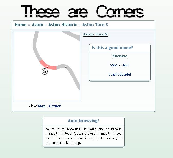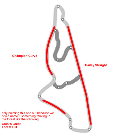 Interesting to see that some people already have the same ideas for corner names that I do... I was suprised to see I'm not the only one that calls the SO classic chicane the "bus stop", and Aston's "Boomerang"