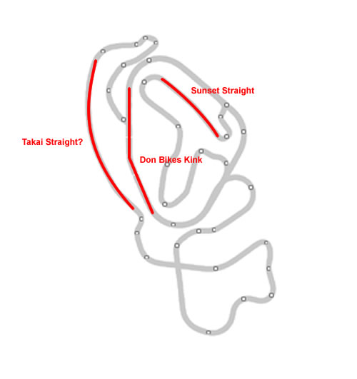 At Kyoto, the turn you named Don Bikes Kink should not be named... It's an oval turn, and turns like that on the s/f straight are always called dogleg or tri-oval. You could name the straight Don Bikes Straight/Shute.. You specifically named the corner though.