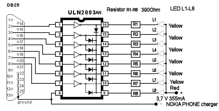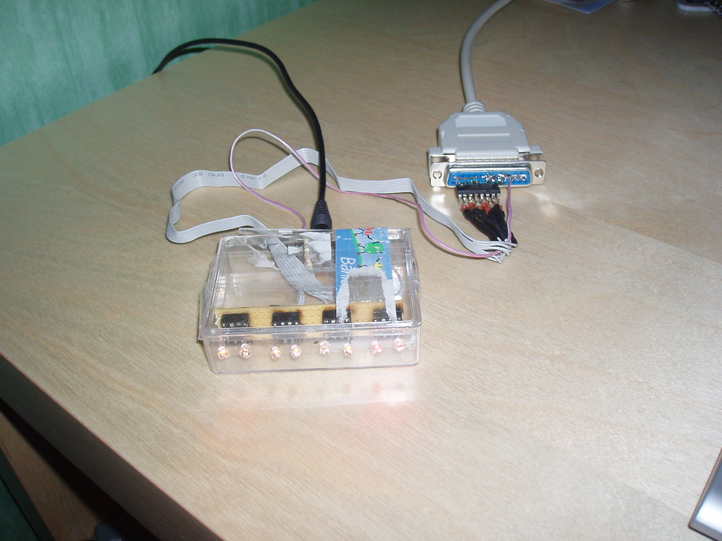 I just recently made something similar too, though my LEDs are just directly connected to the parallel port data pins with resistors in between. Since there's eight data pins you can have eight LEDs with this method, but it can be a bit risky if you dont have specifications for how much current your parallel port can source.
