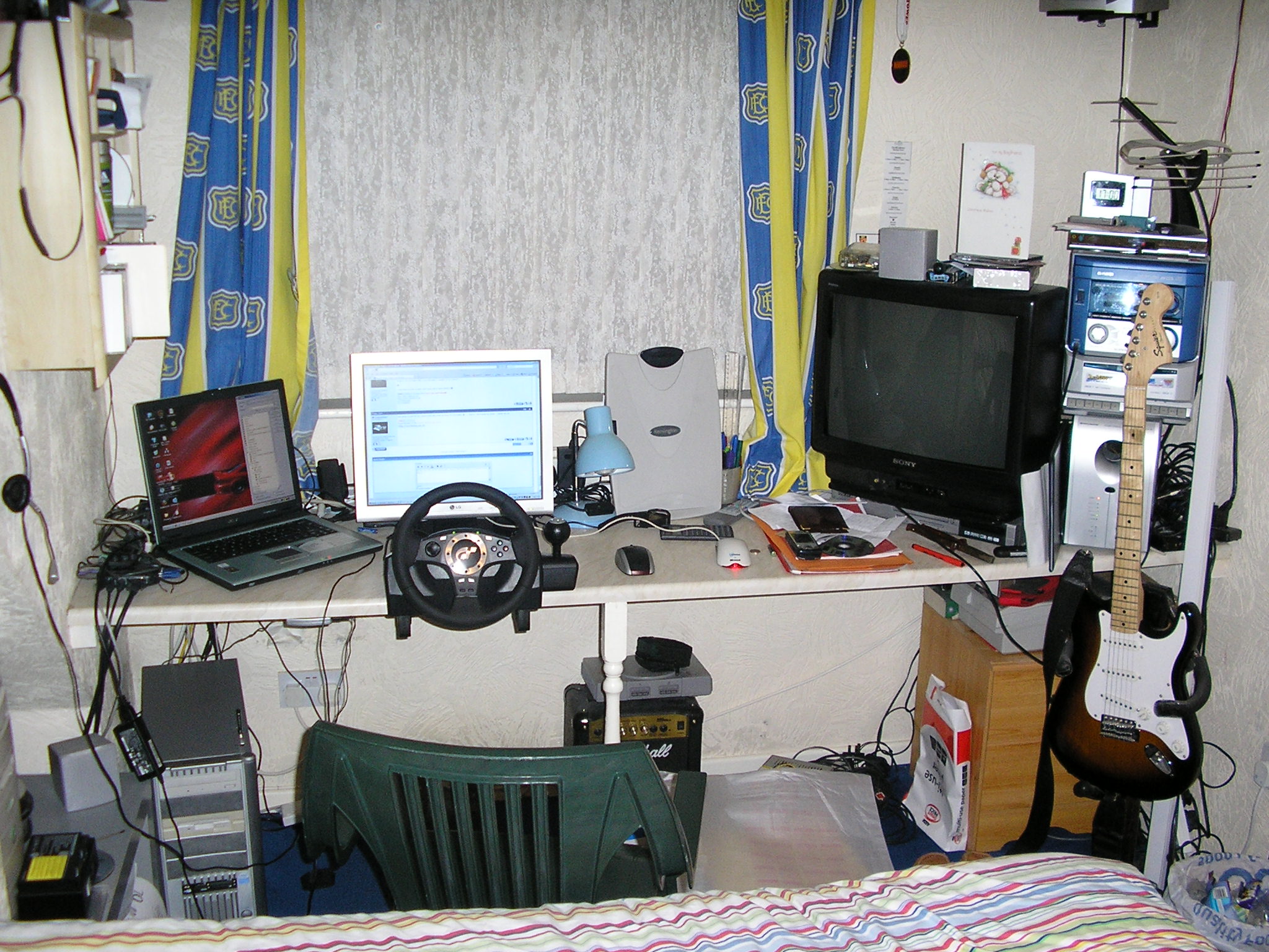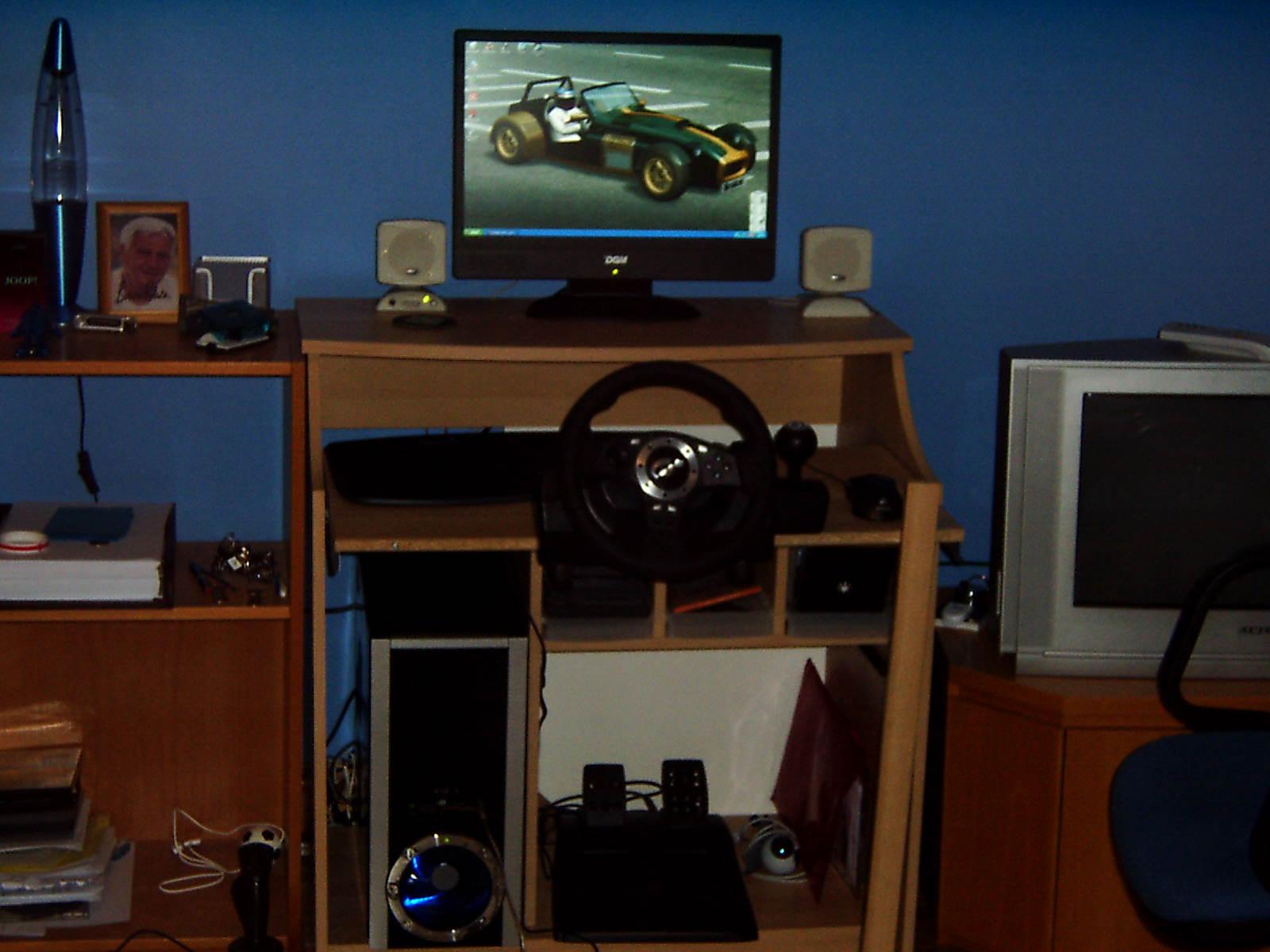 Quicky pic taken just now. The place is a mess as it`s semi-sort of about to be decorated. I`m planning a cockpit thing for racing and flight sims, but that`ll have to wait until I can be bothered (and can find the right seat for it)