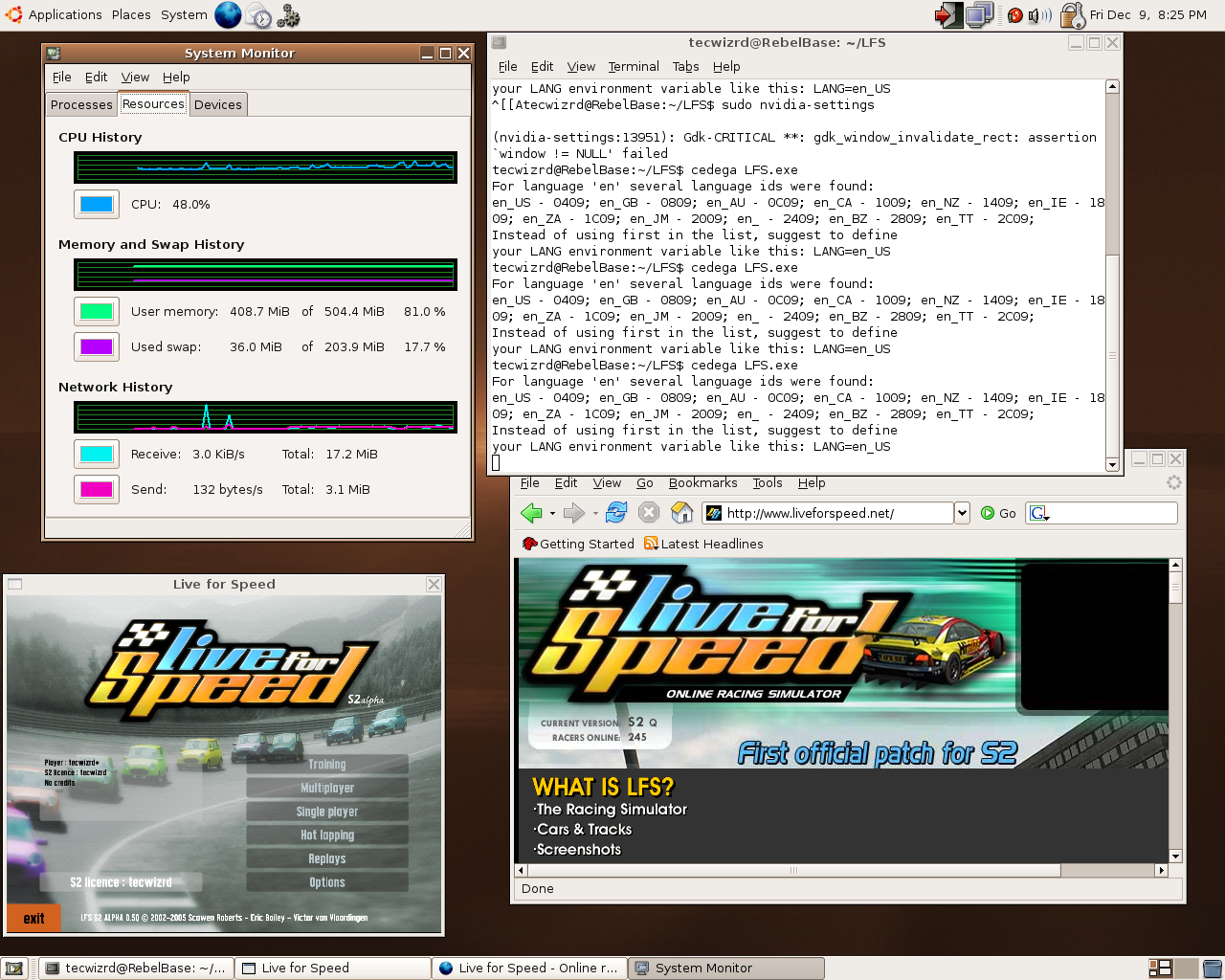 I've included one more screenie. I really just wanted to prove it works. I circled the FPS counter in the LFS window, it's below 30 because the screenshot program maxes out the CPU when starting. I have the perf mon up to show the mem usage and CPU cycles. The machine is an Athlon XP 3000, 256mb ram, 200gb HD, TV card, 2 nics, ieee, usb2, dvd, cd-rw, NV Gforce 5600 FX 256mb. This OS and Machine are very stable. I could run 2 instances of LFS in window mode and still play or do other work. Linux rocks.