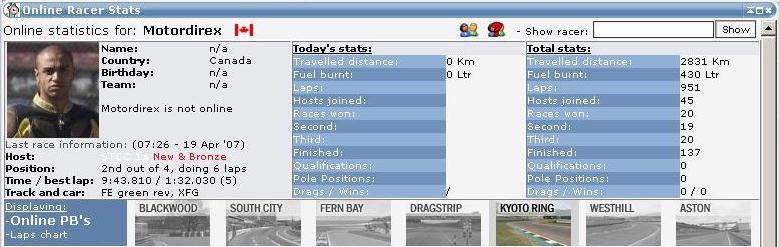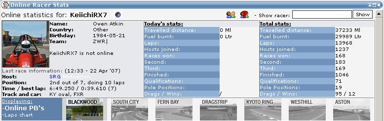 As for KeiichiRX7`s comment, based on your stats compared to mine and comparing the amount of races you have over me, we are pretty close as far as top 3 finishes: your 49% to my 43%. This compared to your total 1046 finished races, to my 137...and that youve done 13017 more laps then I have. So I guess your right, you do know more then me...way to go champ!
