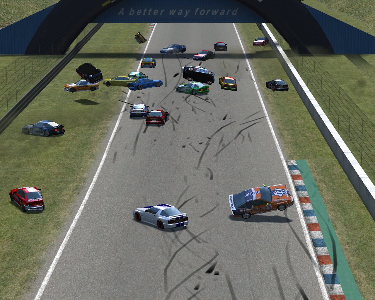 2). same combo again, but loads of cars. watch player "Sheepy" at approx. 1:20 of the 1st lap, as he contacts with another driver. and at 1:35 watch "sccc. popeye" as he slightly touches a damaged car at full speed and looses control.