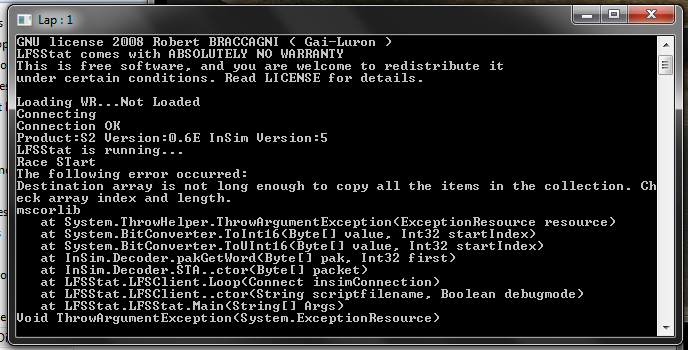The following error occurred: Index was outside the bounds of the array. Graph at Graph.RprData.Stats() at Graph.RprData..ctor(String fn) at Graph.Graph.GenerateGraph() at LFSStat.LFSClient.exportRaceStats(String datFile) at LFSStat.LFSClient.Loop(Connect insimConnection) at LFSStat.LFSClient..ctor(String scriptfilename, Boolean debugmode) at LFSStat.LFSStat.Main(String[] Args)