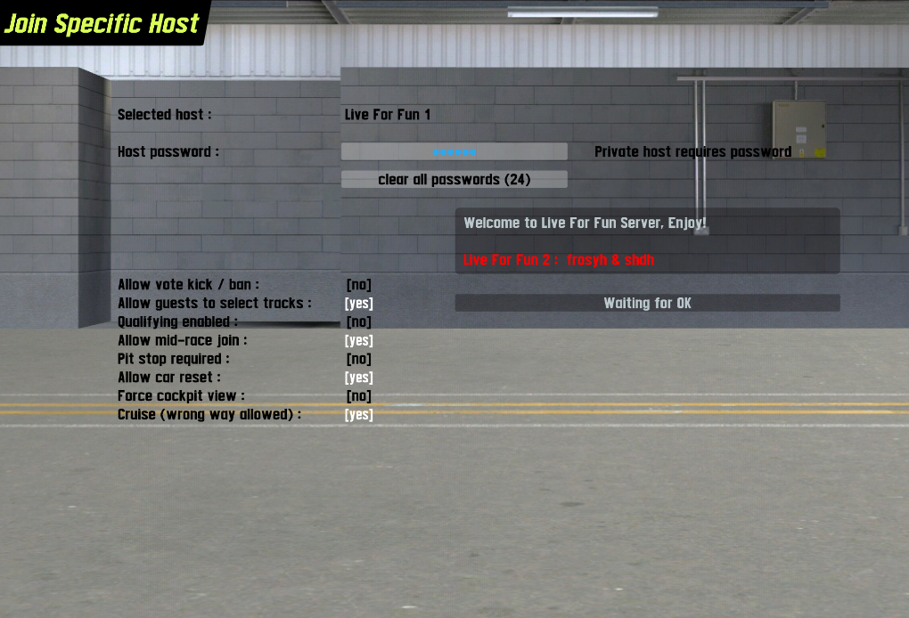 Quote from Mauni :I had this problem already in W. Usually restarting LFS or changing language(??!!) did the trick. With patch X it came very frequent, but I think I found solution for me. So far every time I've turned off automatic skin download, I have gotten into server every single time.