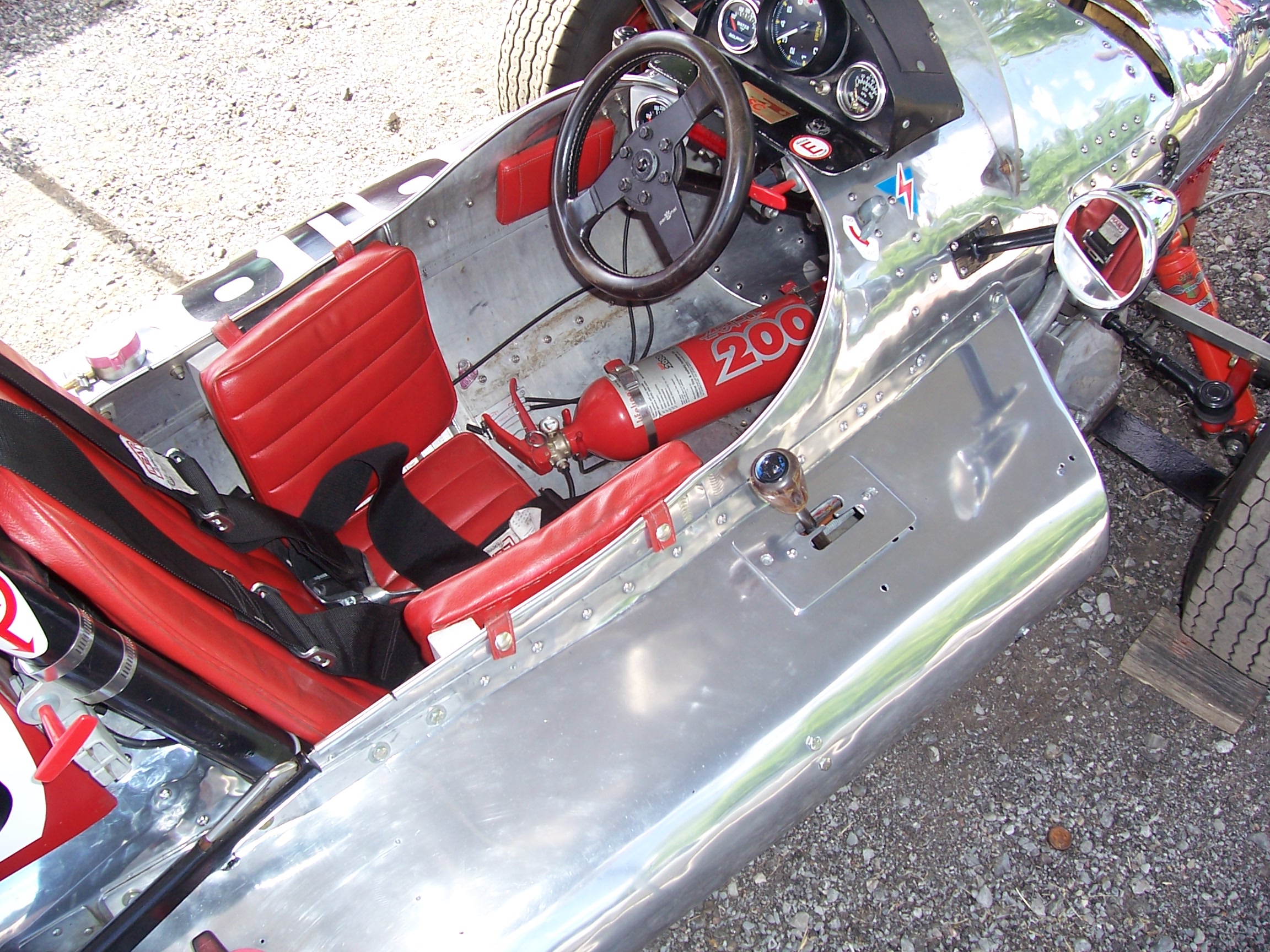I've been at the Mosport Vintage event all day (and will be all weekend) and this little number was on track. The driver's arms are literally out of the cockpit, elbows over the 'sidepods.' The gear shifter itself is mounted on the top of the sidepods. Looks insanely dangerous, especially at a high speed track like Mosport.