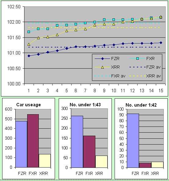 This shows that the difference between the best car (the FZR) and the worst (FXR?) is not enough to put people off driving the FXR. From driving the server my feeling is that half the field is usually using the FXR.