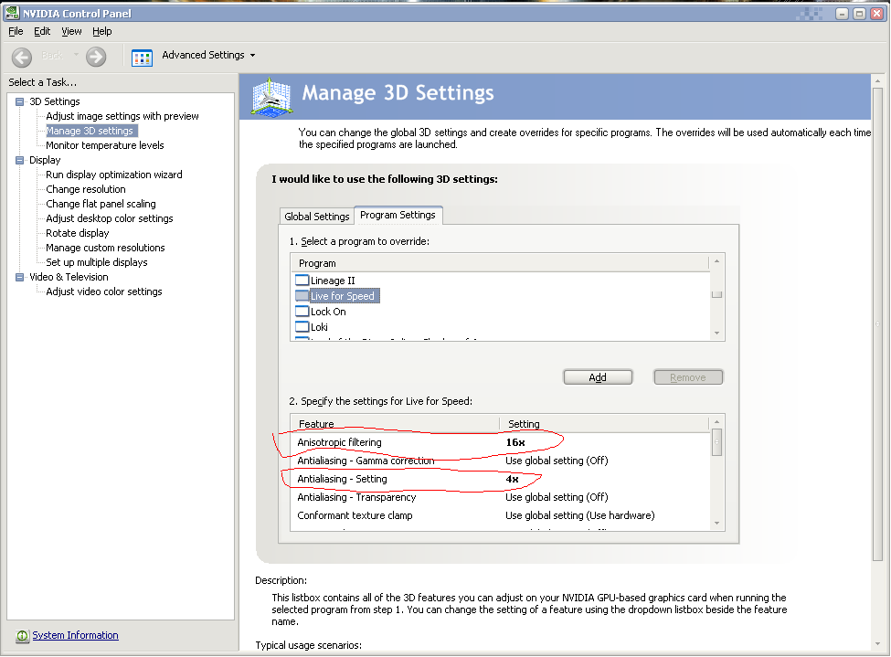 Now with all the settings for graphics turned up in LFS with resolution of 1440 x 900 I get hot lap frame rates that peak at 59.7 fps and pretty much stay above 50 the whole time. Now I have tried changing the aa settings and all the other settings mentioned here and the fps nor the picture quality change. I have tried using the nvidia control and also the Nhancer control. I have tried turning the antialiasing on 16xQ and anistropic on 16 but it doesn't make any difference in fps or image to when they are turned off.