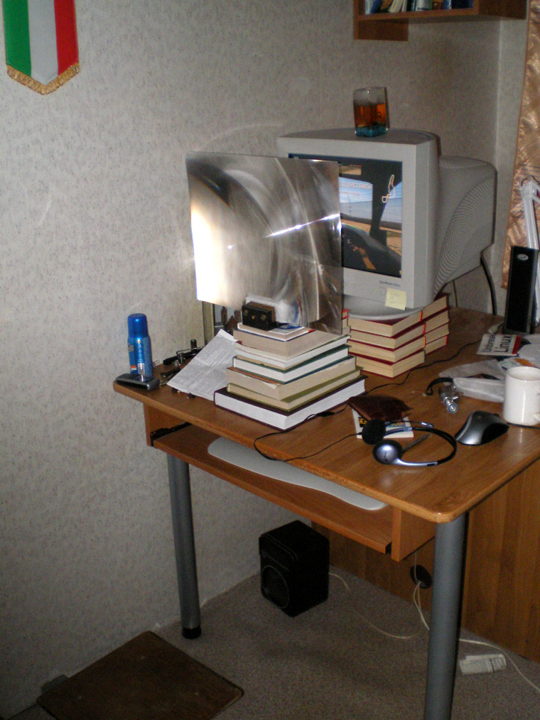 I supposed something of this kind, but couldn't imagine it would be such a problem. So, I had to rise the center of the lens (and monitor as well) up to the level of eyes. Still, these books in the picture were not enough. I didn't want to risk to raise things higher, and instead took an old small stool.